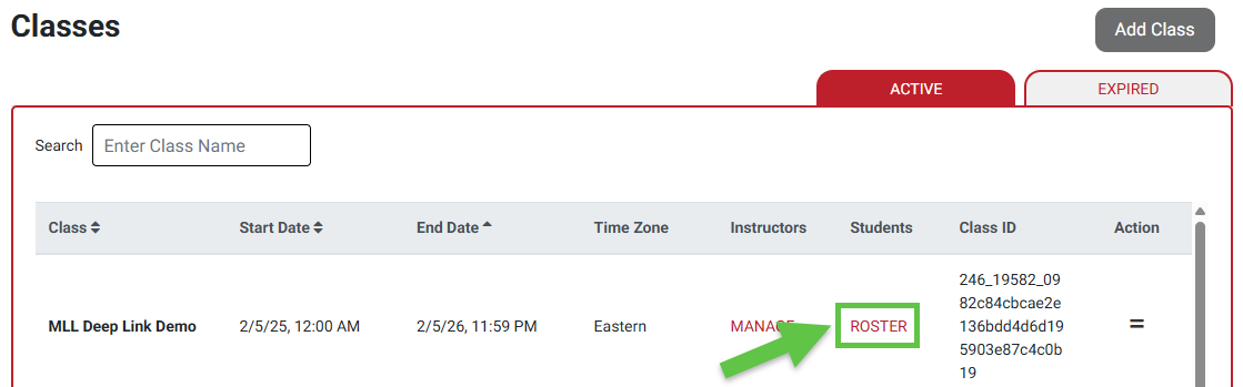 To confirm all your students are within your integrated MLL class, click the "Roster" link for the appropriate class on your MLL Classes page. Please confirm your MLL class roster a few days after your class start date, to ensure all your students have enrolled correctly.