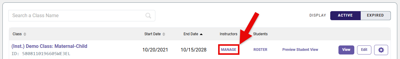 To add an additional instructor to your class, click "MANAGE" underneath the "Instructors" column for your class.