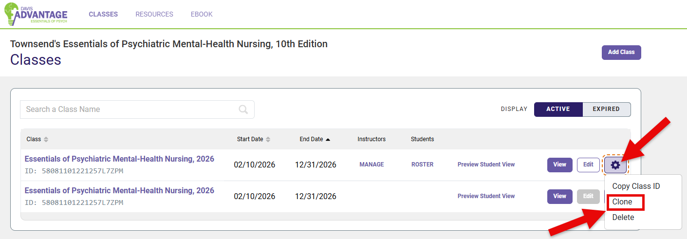 Please note that you can only copy class content using the same edition of the same textbook. If your school may have changed textbook editions recently, you can confirm which edition the previous class was by launching the Classes pages for each respective edition and finding the Advantage class you intend to copy.