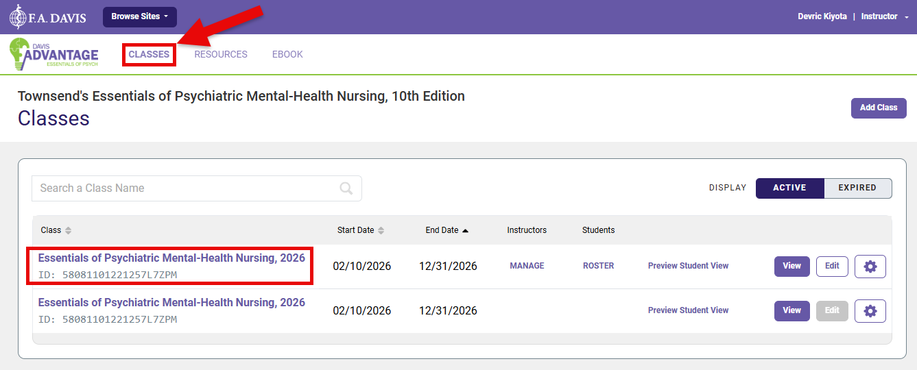 After successfully launching an Advantage class link, navigate to the Classes page for your required textbook.