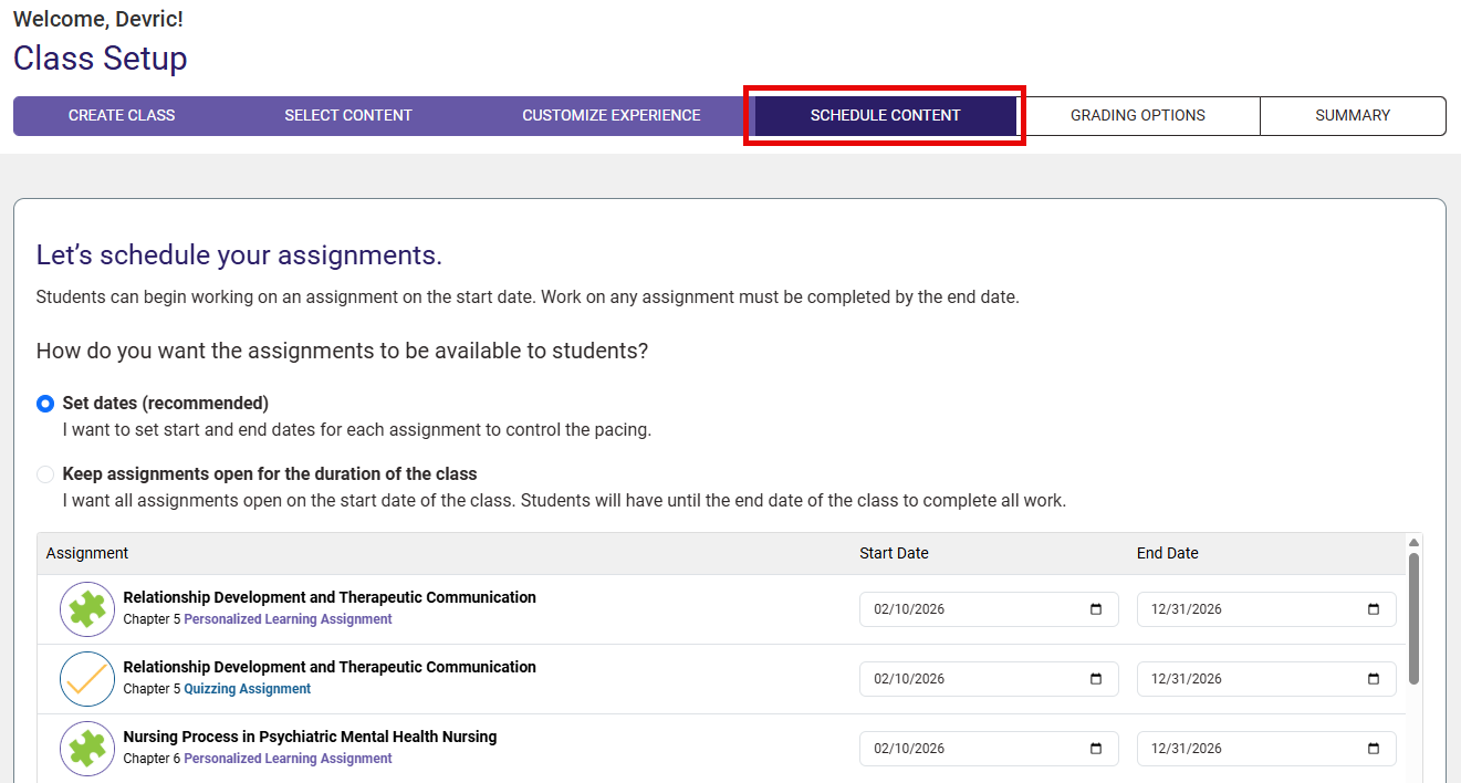 Most of your original Advantage class settings will carry over as part of the class cloning. The bulk of the settings you will need to edit (for each clone, are the assignment due dates, which can be found under the “Schedule Content” tab of your Advantage Class Setup.