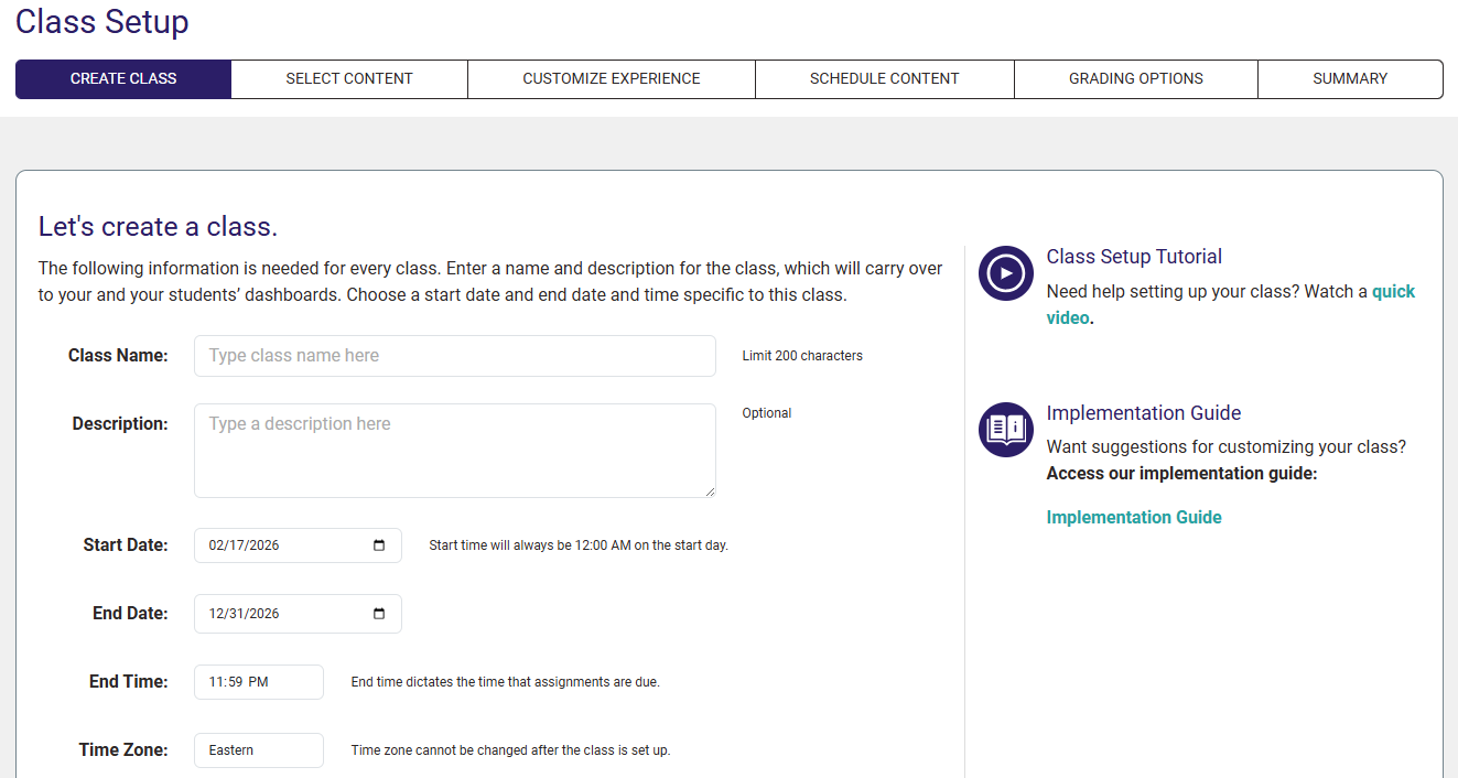 Progress to the "Summary" step of your Class Setup, confirming or changing settings as needed.